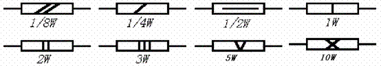 额定功率:在规定的环境温度和湿度下,假定周围空气不流通,在长期连续负载而不损坏或基本不改变性能的情况下,电阻器上允许消耗的最大功率。为保证安全使用,一般选其额定功率比它在电路中消耗的功率高1-2倍。额定功率分19个等级,常用的有0.05W0.125W0.25 W0.5 W1 W2 W3 W5 W7 W10 W,在电路图中非线绕电阻器额定功率的符号表示如下图: